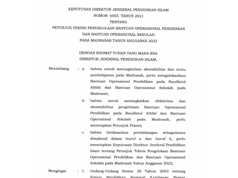 Dalam rangka efektifitas pengelolaan pembelajaran di Madrasah pada Semester Ganjil TahunPelajaran 2021/2022 berdasarkan SK Dirjen Pendidikan Islam Nomor 1836 Tahun 2021 tentangKalender Pendidikan Madrasah Tahun Pelajaran 2021/2022, serta memperhatikan Instruksi MenteriDalam Negeri Nomor 62 Tahun 2021 tentang Pencegahan dan Penanggulangan...