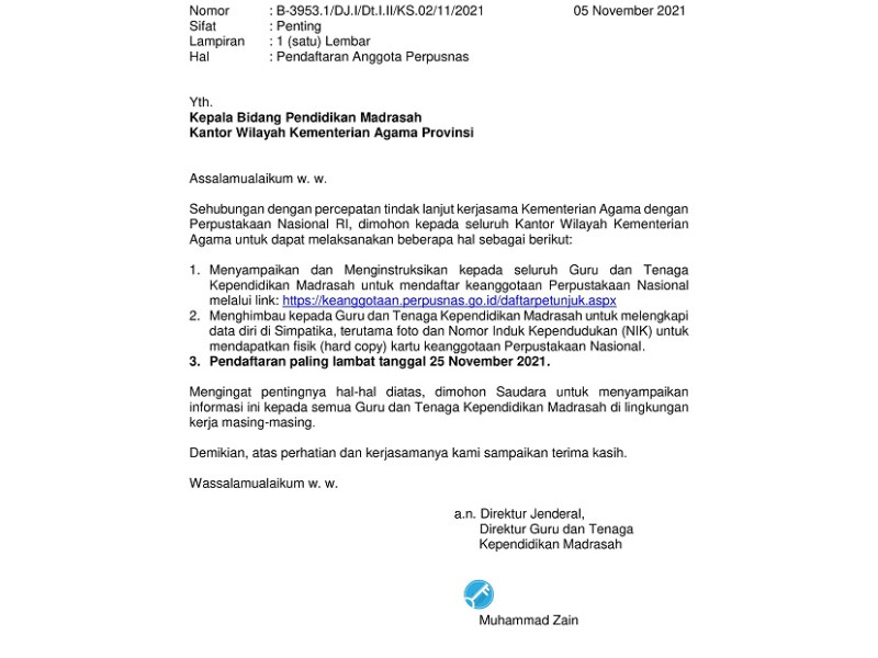 Sehubungan dengan percepatan tindak lanjut kerjasama Kementerian Agama denganPerpustakaan Nasional RI, dimohon kepada seluruh Kantor Wilayah KementerianAgama untuk dapat melaksanakan beberapa hal sebagai berikut:1. Menyampaikan dan Menginstruksikan kepada seluruh Guru dan TenagaKependidikan Madrasah untuk mendaftar keanggotaan Perpustakaan Nasionalmelalui link: https://keanggotaan.perpusnas.go.id/daftarpetunjuk.aspx2....